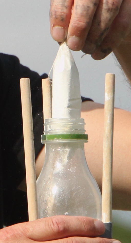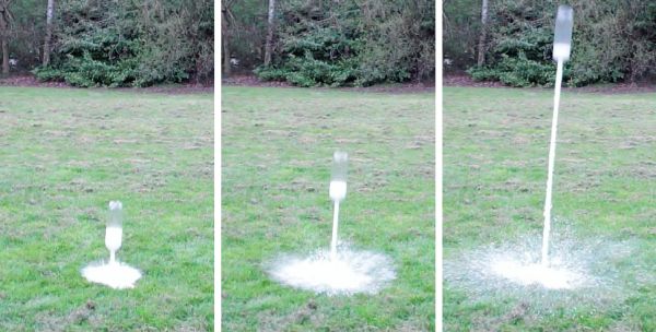Så er det bare og slippe t-posen med bakepulveret oppi flaska, presse vinkorken fast i tuten, snu flaska, riste den litt, sette den på et stødig underlag og klar ferdig gå.... NB: den flyr høyt, så det er lurt og gjøre dette ute eller ha god høyde under taket.
